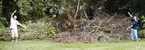 I tried to take pictures of the brush pile in the back yard before. None gave it justice. So we set the camera on a post at the garden and ran down to get in the shot. Remember that this pile is easily 8 ft deep in places. Either we get some serious bonfires going, or we do some whittling. For now, we felt it was best to go to Mike's and get a tasty burger.