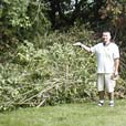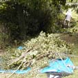 Jul and I went back and got the branches back to the pile. We used our patented 'dragging tarp' technique. I really must get Todd a new tarp when I am finished all this. Maybe a pretty one, with flowers. Once we finished up with the first set of sticks, we went on to the rest. Jul's company was much appreciated. Often when I do work by myself I get songs stuck in my head. It's really quite frustrating at times. Jul and I cut and tarped all of rest of the 2nd shrubbery section, a lot of it at 12 foot tall. The last picture is a good shot of Jul getting some refreshments from the local hose.