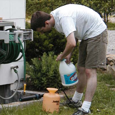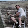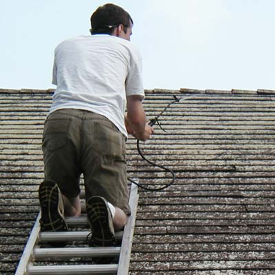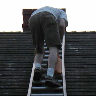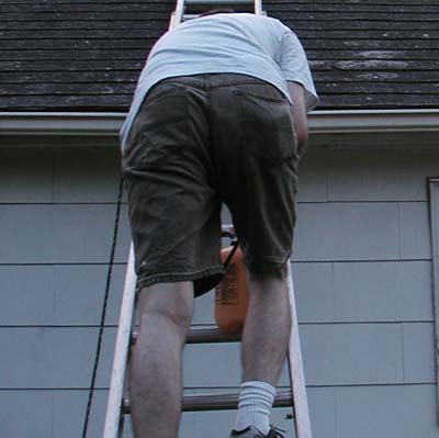 The back of the house was much easier to manage. I went from one side to the other and sprayed over the top of the roof. It went quite well. The remainder of the spraying consisted of climbing up and down. Jul's evening consisted of holding the ladder, with his foot. "Hey Jul. Did you know that the only thing more boring than laying on a roof, spraying bleach... is to be the guy holding the ladder for the guy laying on a roof, spraying bleach."