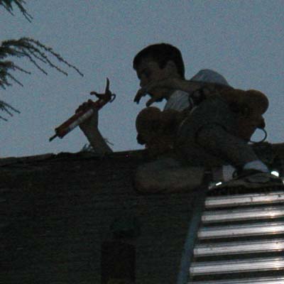 General mess is ok with me, but the asphalt caulk in combination with liquid nails was a bit much (note intential dumb look). I got the job done and climbed down the ladder without touching the rails. After an extended visit with some Lava soap, I was clean, but very very sore. Nothing like getting scraped up on shingles, caulked up with asphalt and then scrubbing it all off with pumice. Ouch