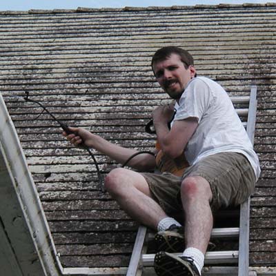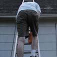 Whew.. so it's all over. Oh wait.. no its not. Next I climbed up to get some shingles reattached. I hadn't ever done that before so I wasn't very good at it. I had a small puzzle of shingles to caulk up. We shuffled the ladder to the edge and I went up to tack things down. Once that was done, the ladder got shuffled even closer to the edge, and I leaned over the edge to tack on some siding that was knocked off. It was getting a little dark and I donned a nifty light. No caulk was left for the siding, (due in large part to my lack of skill) liquid nails picked up the slack. Unfortunately the tube was busted and I mostly had to put it on with my hands.