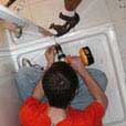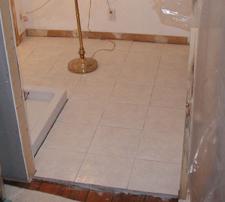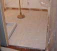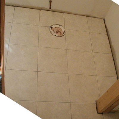 Upstairs in the bathroom area of things, there was quite a bit of progress. Todd and Gwen did a lot of the floor things we needed to have done before the rest was finished. Jul and I came over and polished off the shower. Please note that there were at least 6 pictures of me in the shower with the drill. I figured you wouldn't mind if I reduced it to just this one. After some of that was finished Jul and I came back the next day to help out with the rest of the walls and some finishing touches to the shower