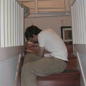 Oddly enough. I messed up the top riser. I forgot to allow for the lip for the very top. I had to pull it out and rip it about an inch and a half shorter. This was quite a pain because the top tread was not easy to get in. I had to cut some of the wood away on the railing so that it would work out without damagine the step. I didn't feel like running out and getting prodective goggles from the shed, so I just used a pair of sunglasses that Chris had around the house. They looked funny enough to warant taking a picture and putting it on the site. Hopefully the stairs will work out just fine without anything else needing to happen to them. | ![]() |