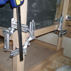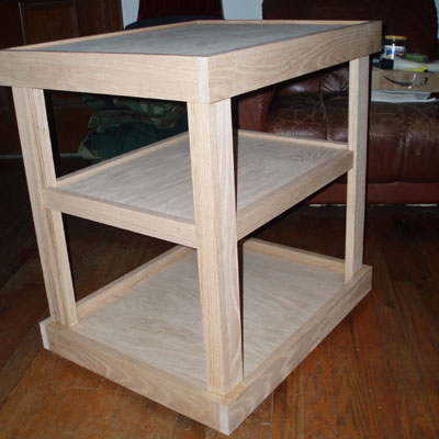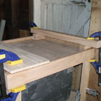 Next I pushed on both side boards so that they moved in to meet the shelf. Once that was done I tightened the clamps and repeated the process with the other two sides. Next I put on the feet and clamped them on using a board crossing two feet at once. After that a good overnight drying. The next night I took a router to most of the corners the outside corners and sanded it all smooth. I didn't have to worry about sanding as much as usual since I had the benefit of my new planer! The planer evens out bumps in the surface in the boards and make is about as smooth as 120 grit paper will.