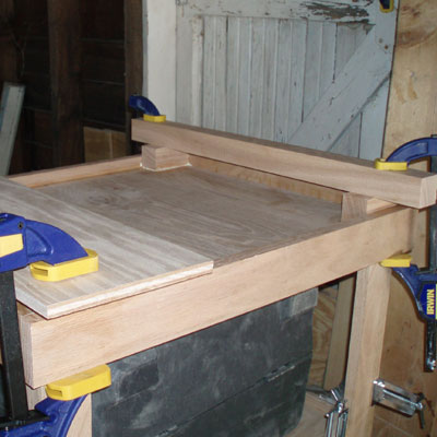 The supports were cut to fit very tightly. They were able to stay in without any glue at all. Of course I did glue them anyhow. The process went like this. I set up the 90degree brackets so that the sides would be at the right place. I then put glue in the groove and on the ends of two of the opposing boards. The boards were then slid into place so that they were flush with the outside of the legs. I then placed the shelf board in so that it rested in the groove of one side board.